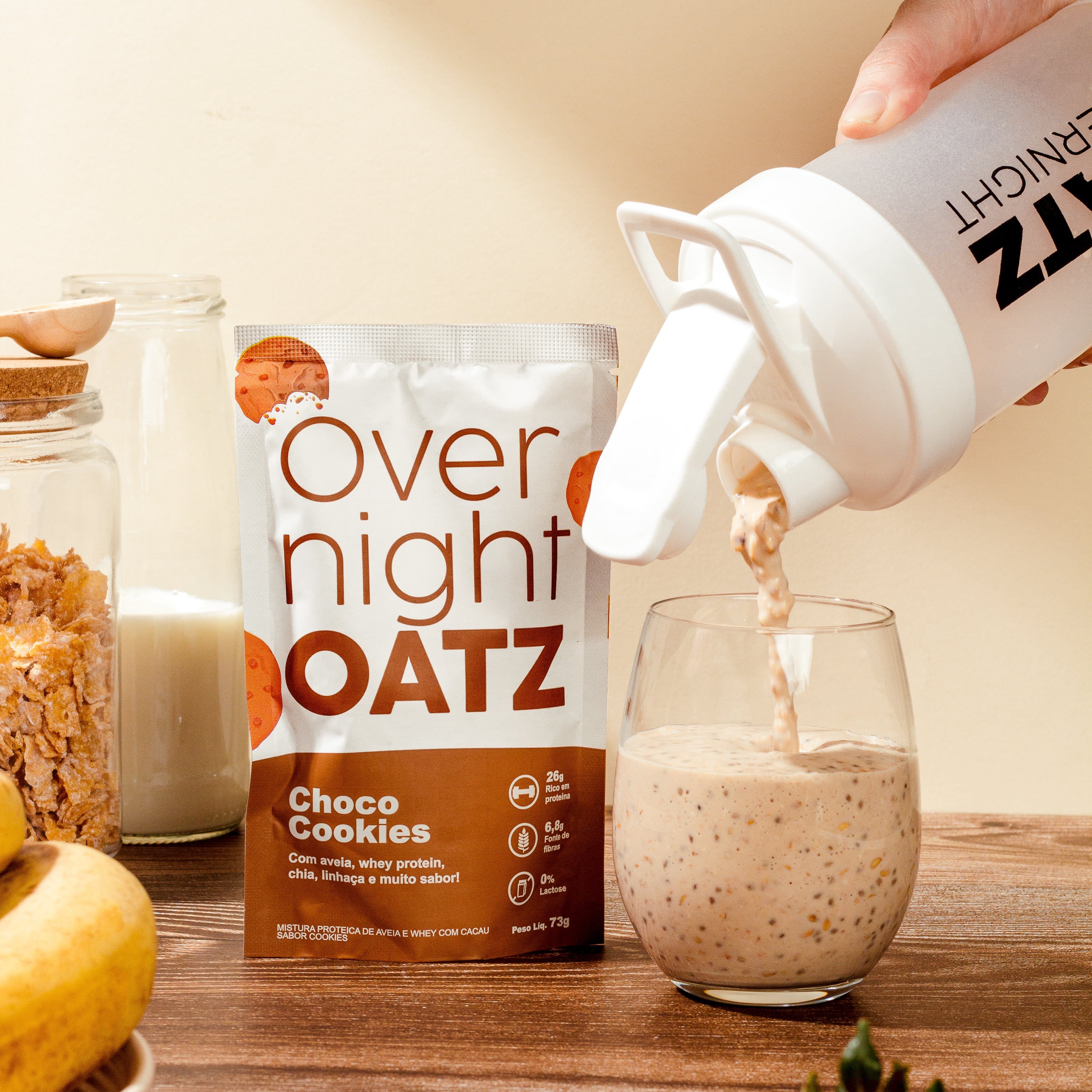 Nosso Overnight Oatz é feito com uma base de grãos ancestrais como aveia, chia e linhaça. Também adicionamos proteínas de alta qualidade, nibs de cacau, aromas naturais e frutas desidratadas (nos sabores específicos), garantindo um produto saboroso, nutritivo e com textura única.